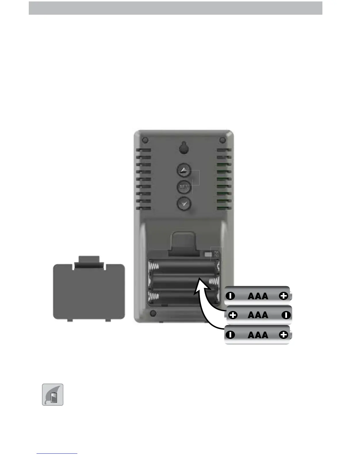 2. Insert 3 x AAA alkaline batteries into the battery compartment, as shown.