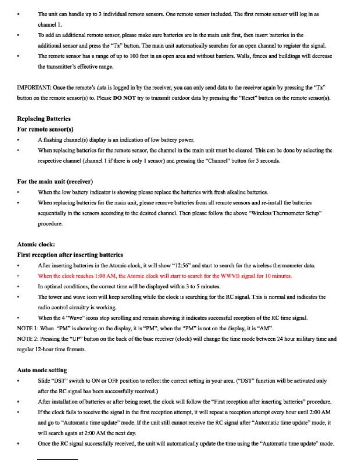 AcuRite 75321A1 - Replacing Batteries; Remote Sensor Battery Replacement; Main Unit (Receiver) Battery Replacement; Atomic Clock Reception