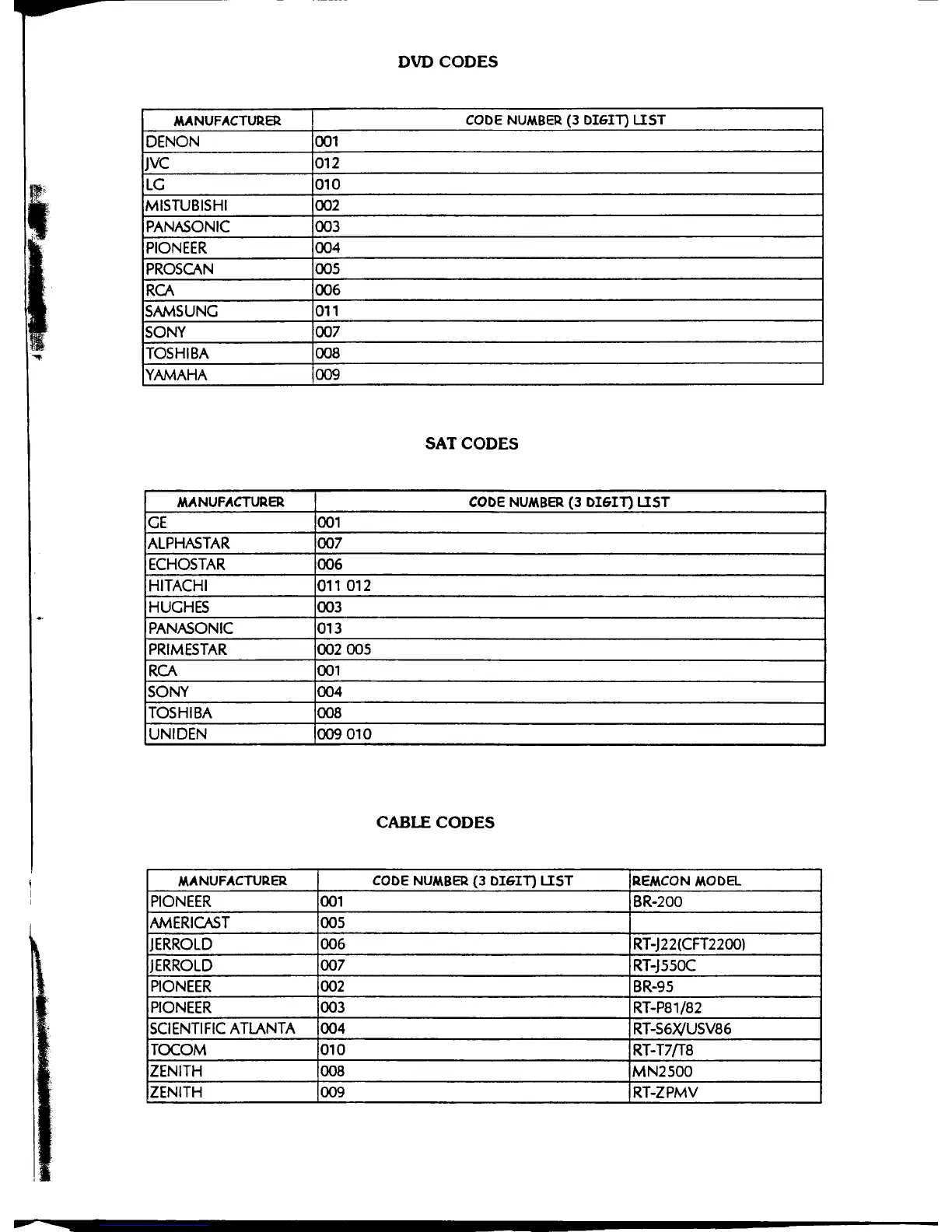 I MANUFACTURER CODE NUMBER (3 DIGIT) LIST REMCON MODel