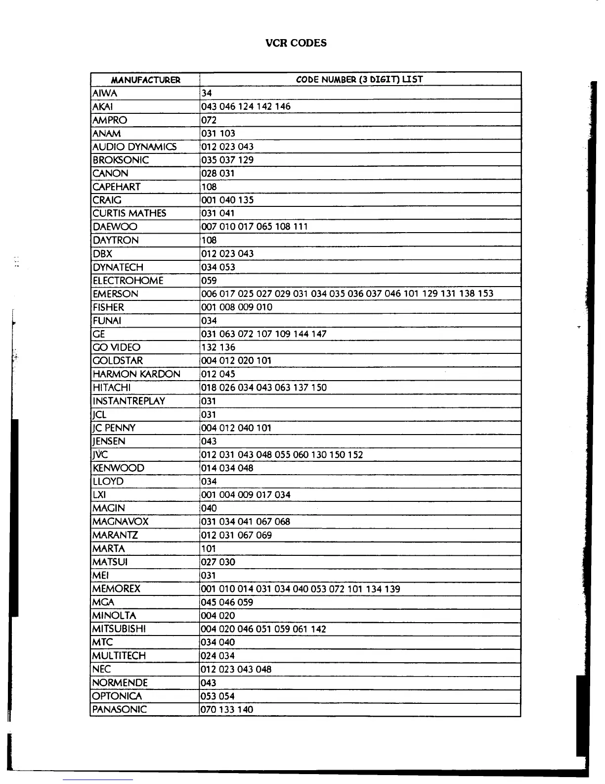 VCR CODES I