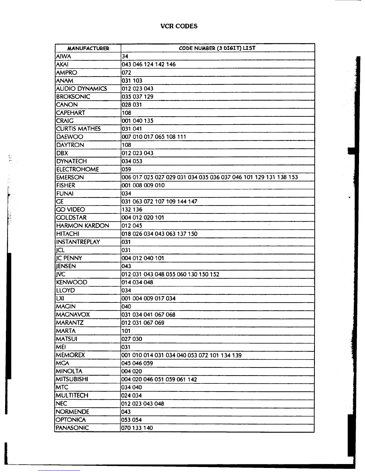 VCR CODES I
