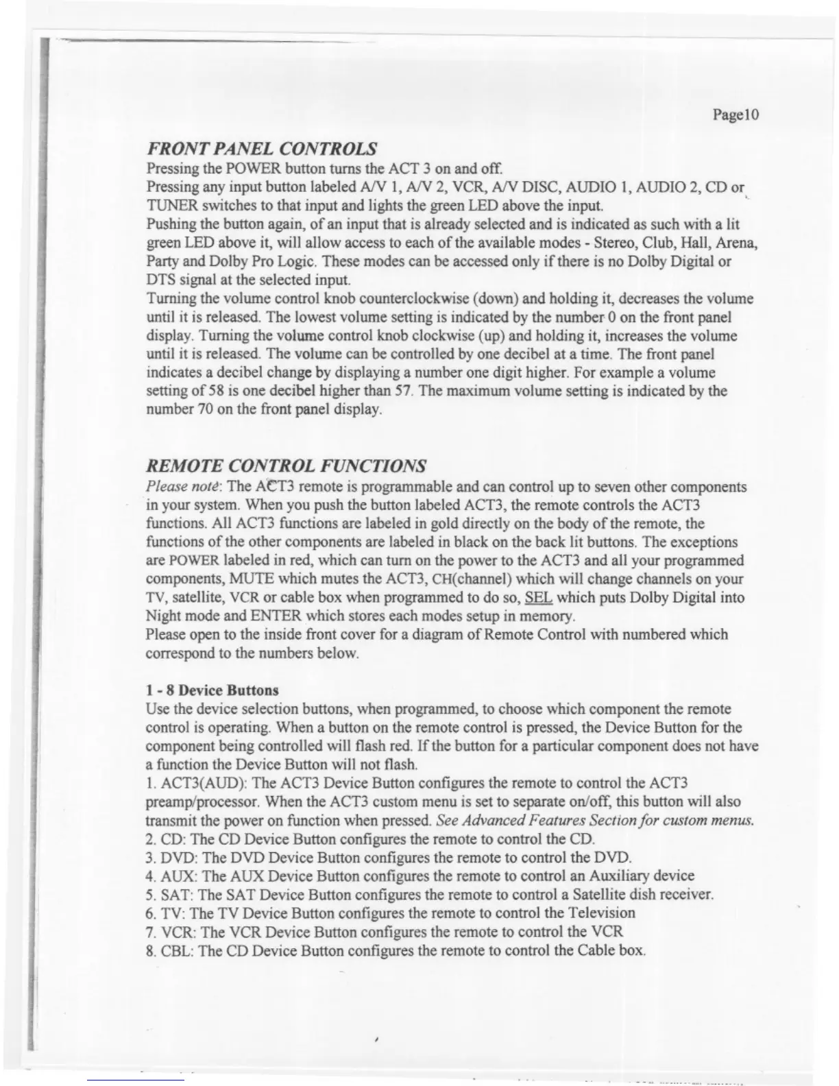 Acurus ACT3 - FRONT PANEL CONTROLS; REMOTE CONTROL FUNCTIONS
