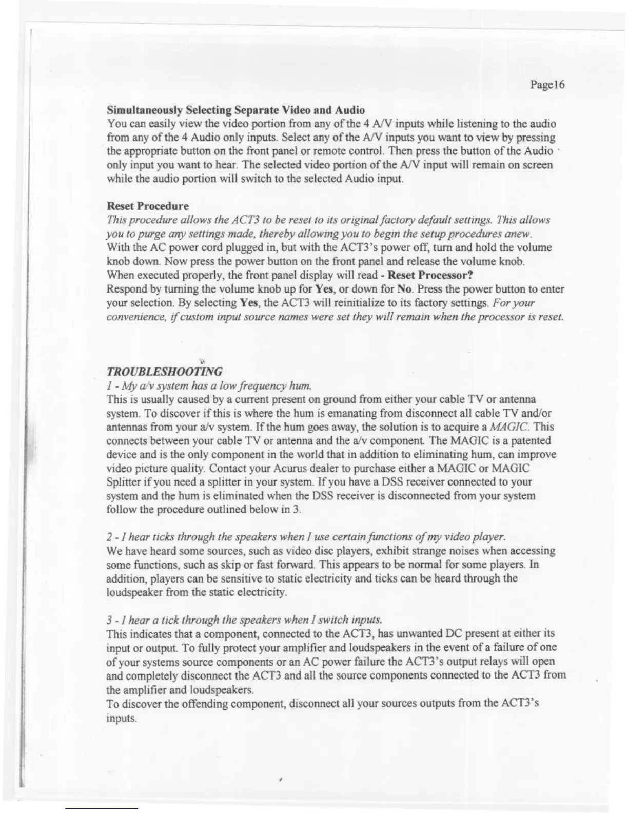 Acurus ACT3 - Troubleshooting; Simultaneously Selecting Separate Video and Audio; Reset Procedure