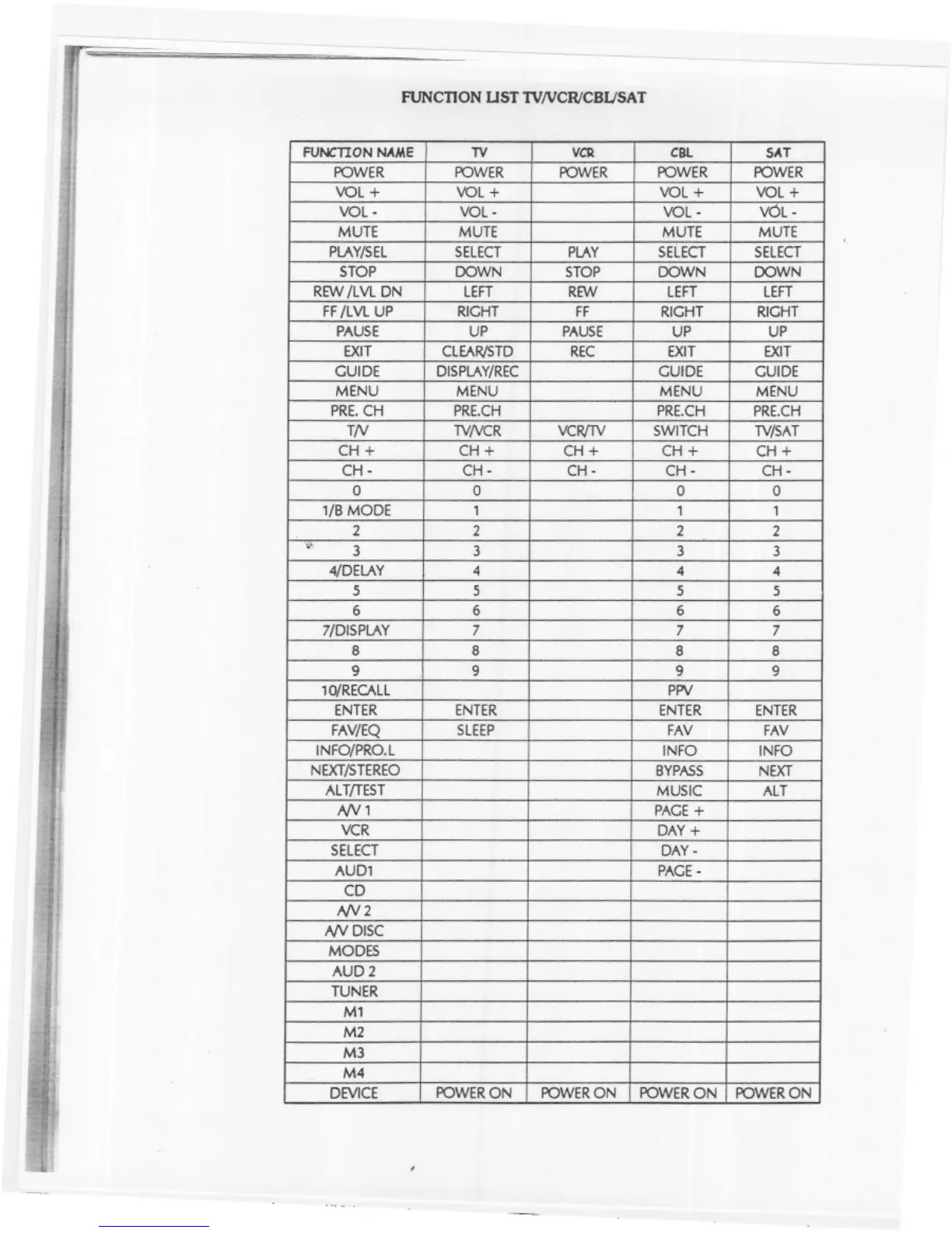 Acurus ACT3 - Function List TV;VCR;CBL;SAT