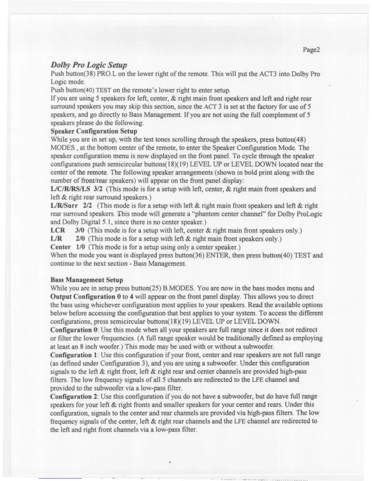 Acurus ACT3 - Dolby Pro Logic Setup; Speaker Configuration Setup; Bass Management Setup