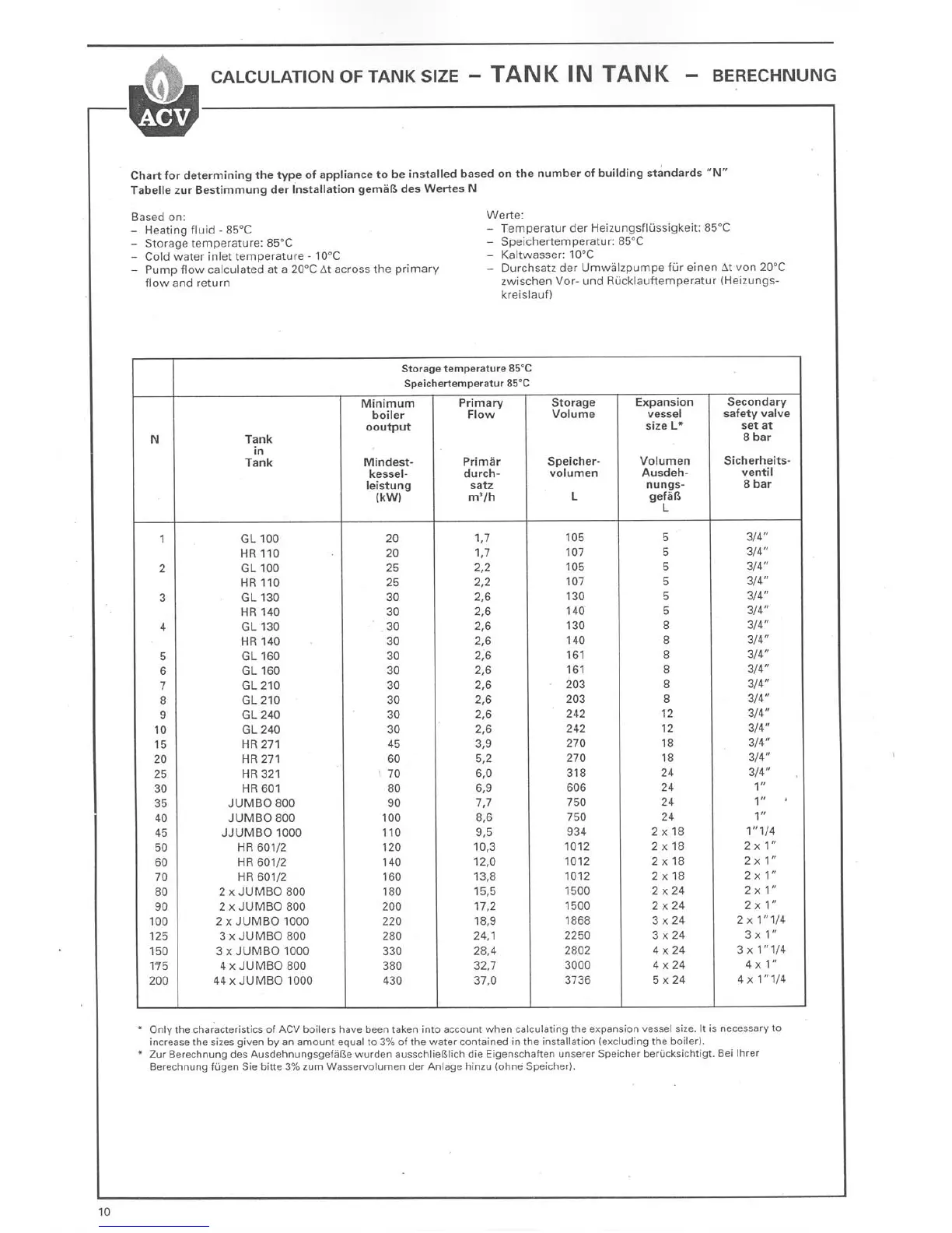 ACV HR 321 - ACV Tank Sizing Chart and Parameters; Tank Selection Chart; Calculation Parameters; Storage Temperature Settings