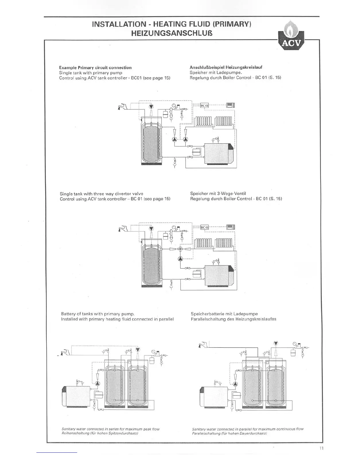 ACV HR 321 - Primary Heating Circuit Installation; Heating Circuit Connections; Single Tank with Pump Connection; Single Tank with Divertor Valve