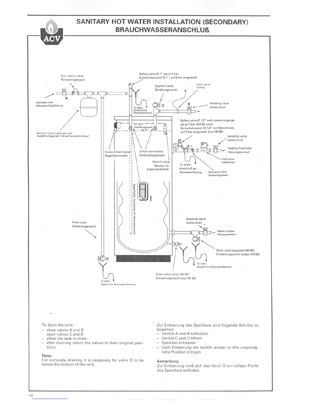 ACV HR 321 - Secondary Sanitary Water System Draining; Sanitary Water System Diagram; Tank Draining Procedure; Note on Complete Draining