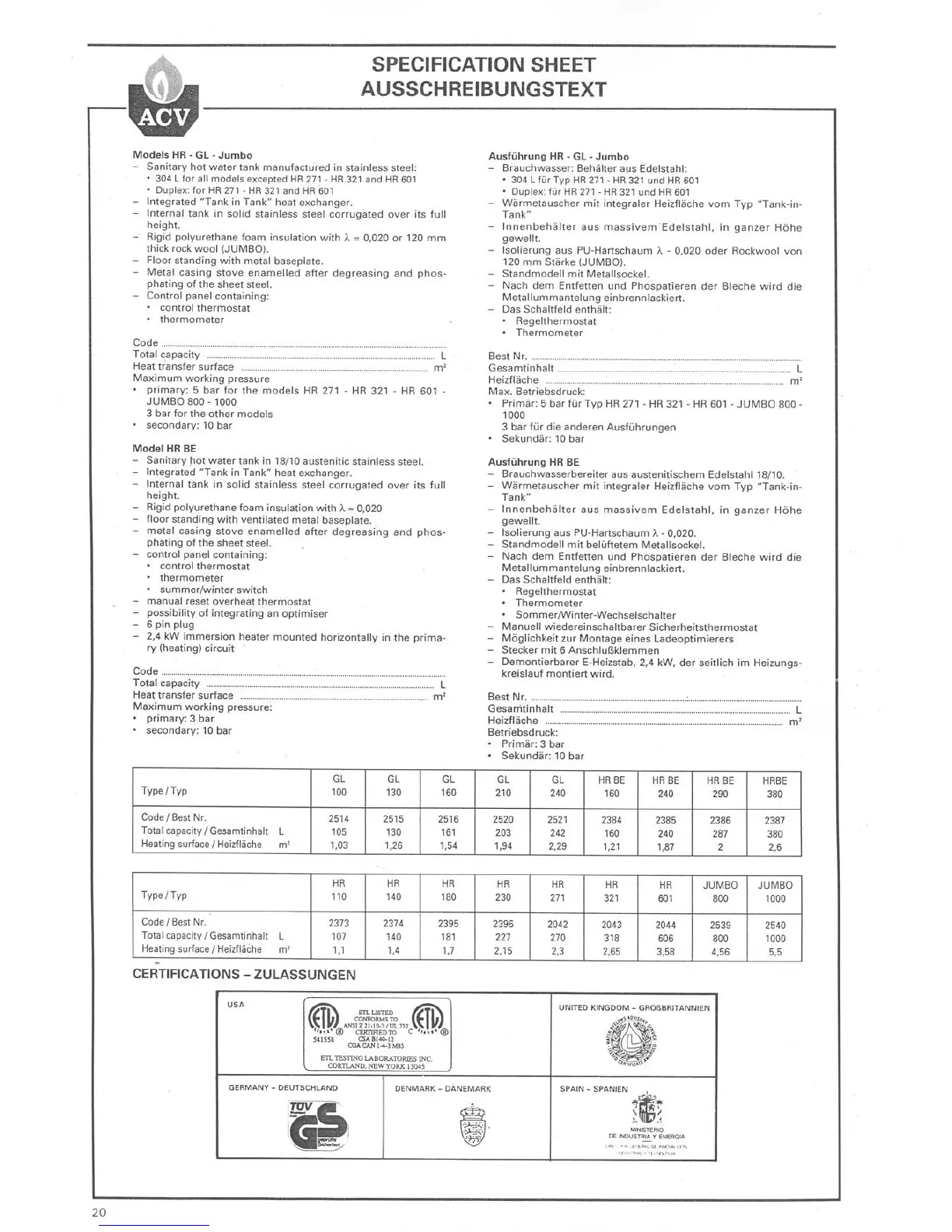 ACV HR 321 - ACV Tank Specification Sheet; Specification Text; HR GL Jumbo Models Specifications; HR BE Model Specifications