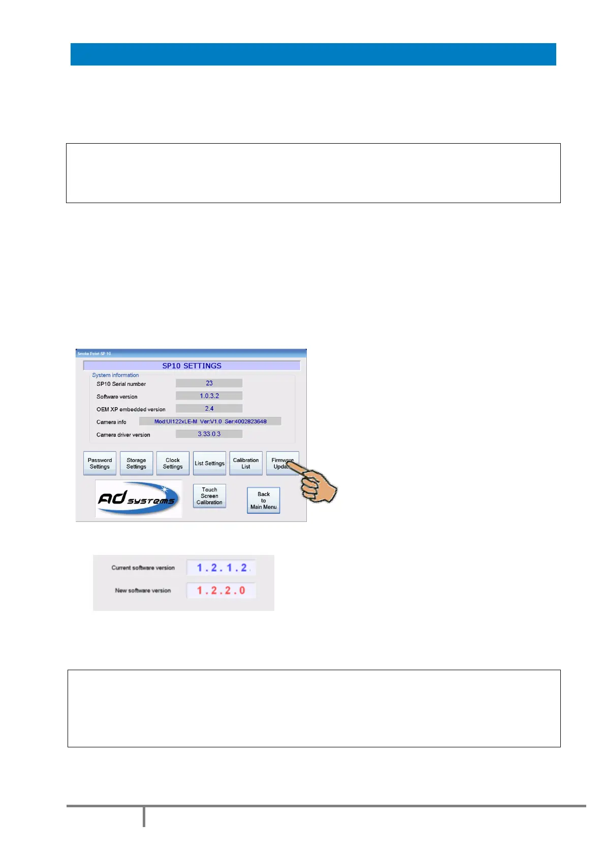 - Go to “SETUP” menu and press the “Firmware update” button