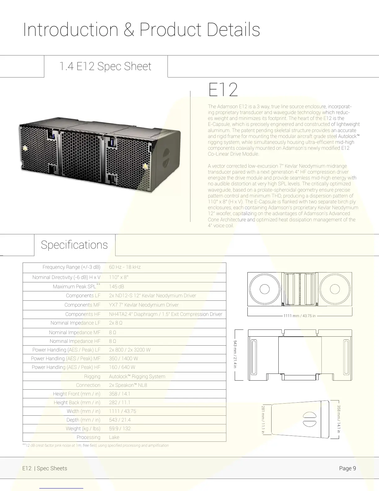 The Adamson E12 is a 3 way, true line source enclosure, incorporat-