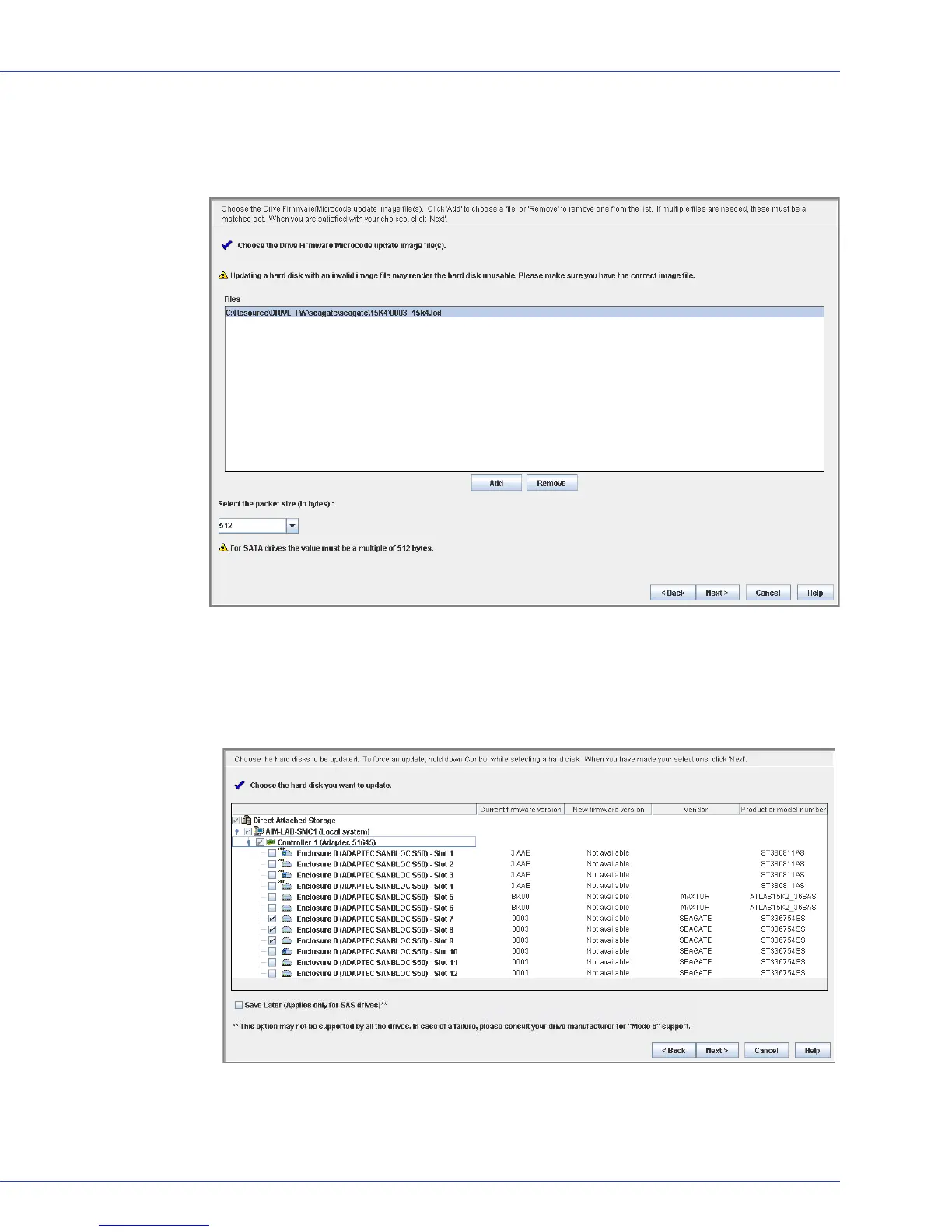 For SAS drives with “Mode 6” support, select Save Later to use the new firmware once,