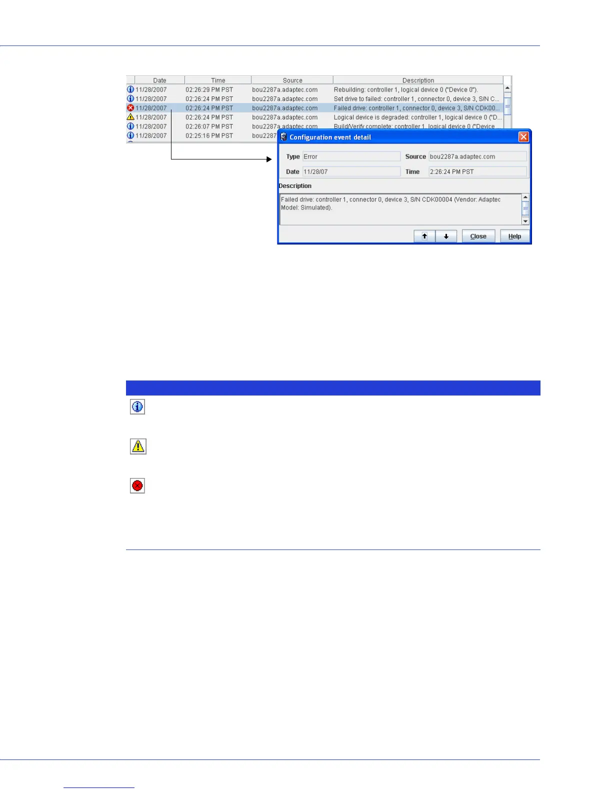 Adaptec Storage Manager indicates event status with icons. This table lists the three categories,
