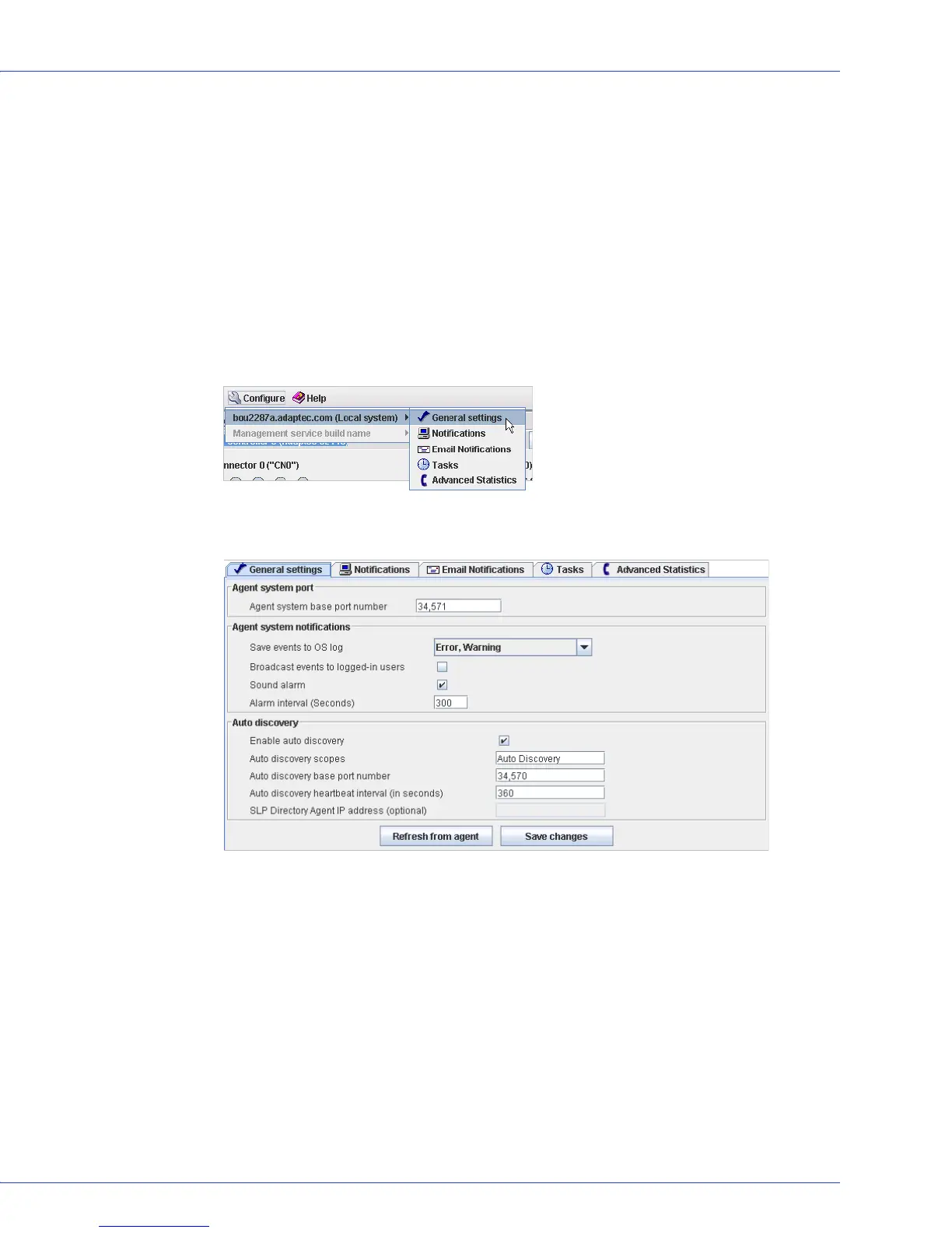 The Adaptec Storage Manager Agent General Settings window opens for the system you