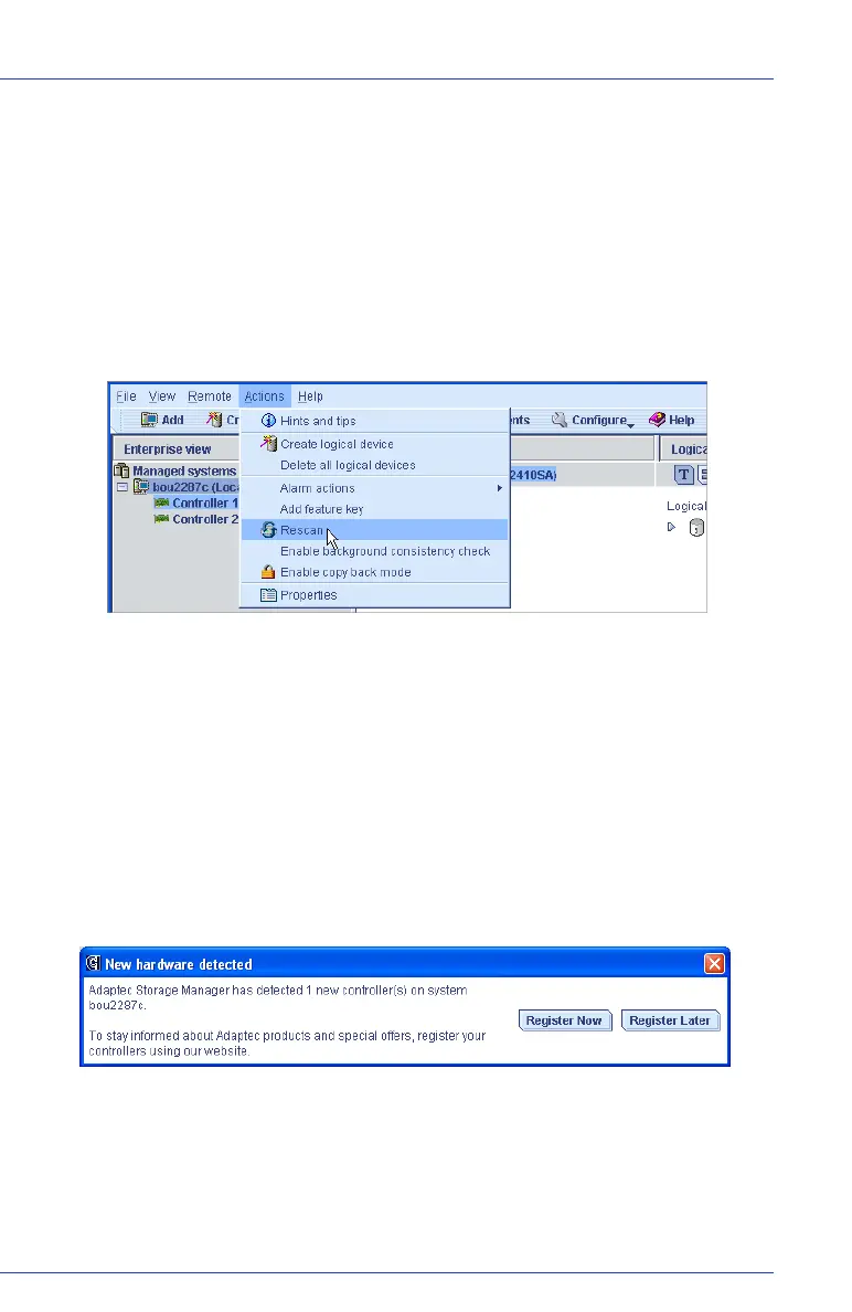 When you log in to Adaptec Storage Manager, it searches for new