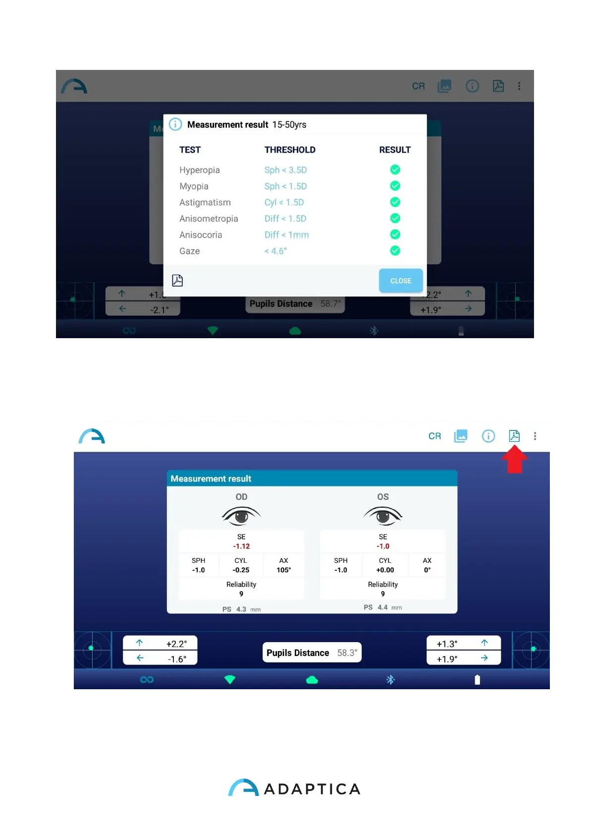 8. Tap on the PDF icon below the screening results table to generate the PDF report of