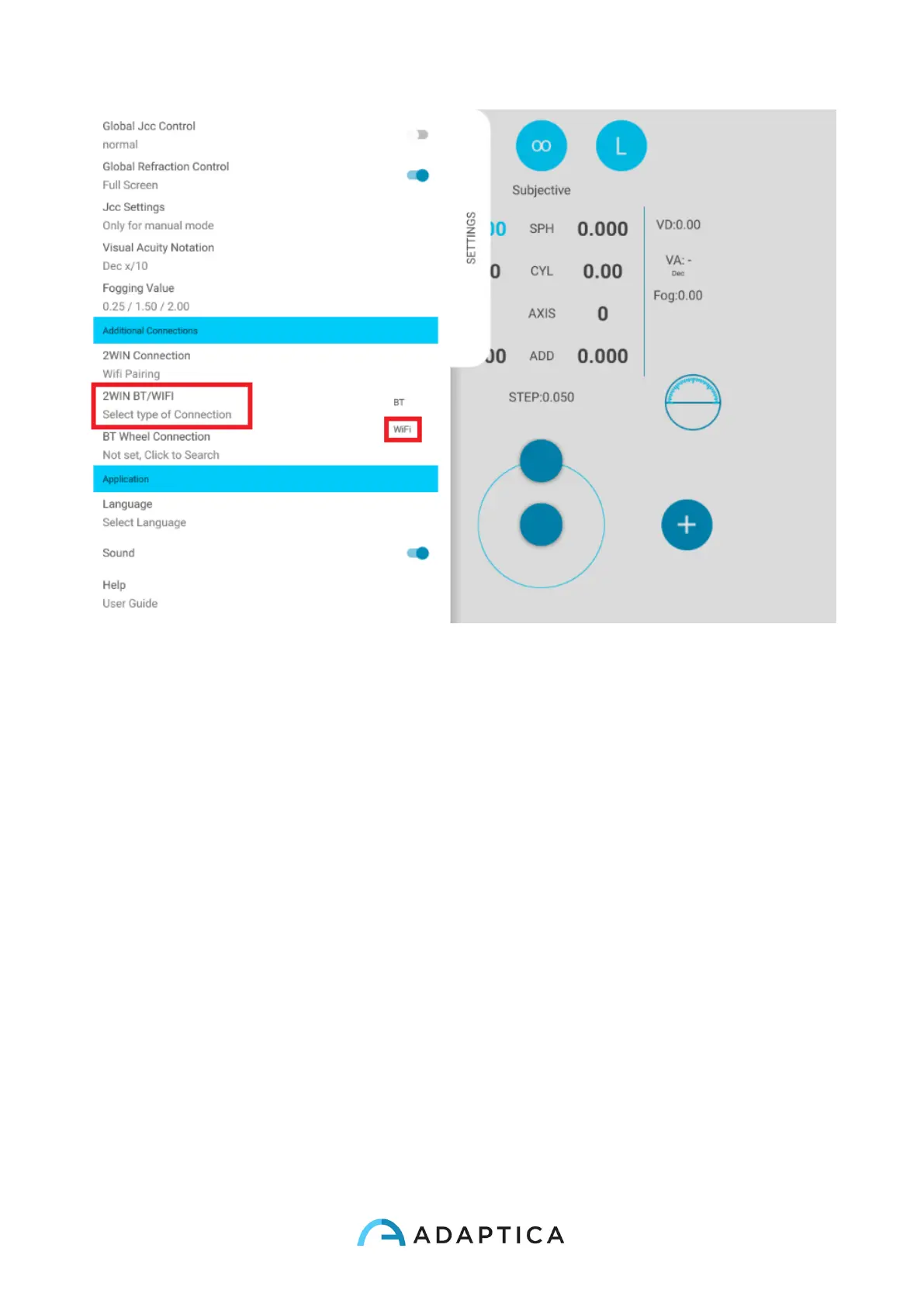 4. From VisionFit SC tablet application enter Settings and select 2WIN Connection.