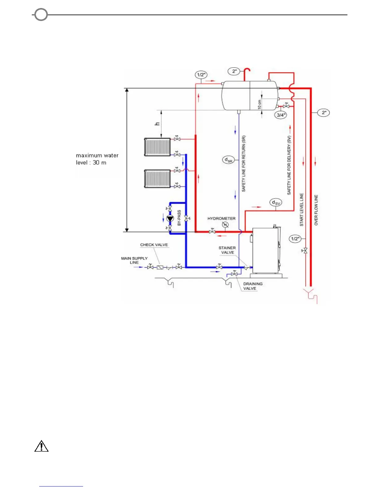 Open type expansion tank must be installed at the heighest level of whole hydraulic system. No globe valves must be