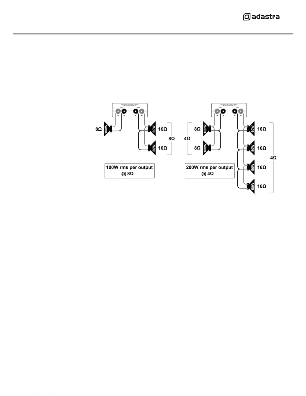 • If the speakers are 8Ω, you can connect up to 2 speakers in parallel to each channel.