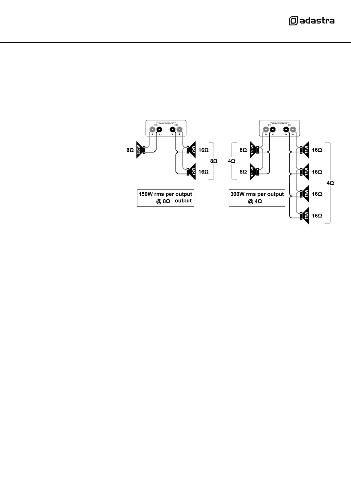 • Note: Some speakers have 4Ω impedance, in which case connect only 1 speaker to each channel.