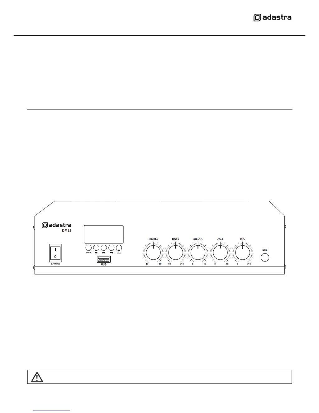 If the output from your Adastra Amplifier is excessively loud or distorted, it may be due to a high input signal level. Try reducing the MIC, LINE IN, USB/SD, and/or MASTER level. Also, ensure that Hi-Z line level inputs are not connected via the MIC input.