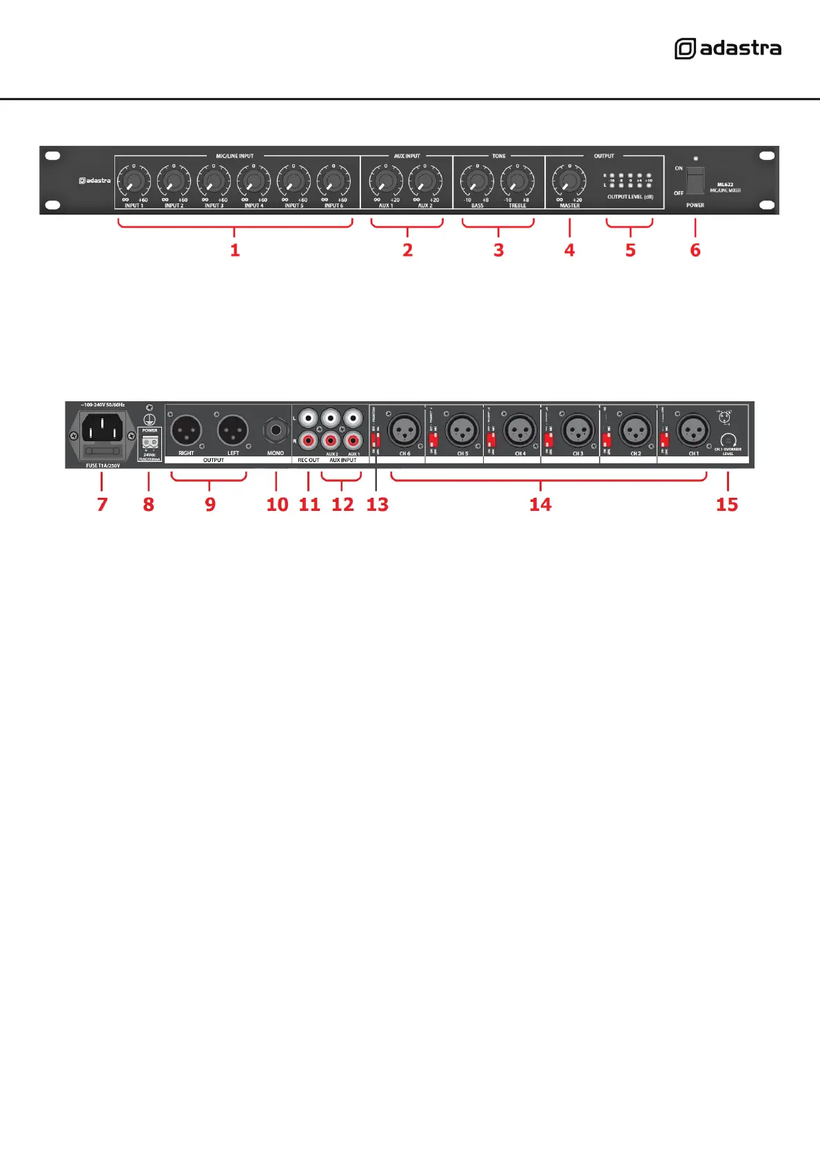 Main output is available via left and right balanced XLR sockets (9) and mono unbalanced 6.3mm jack (10)