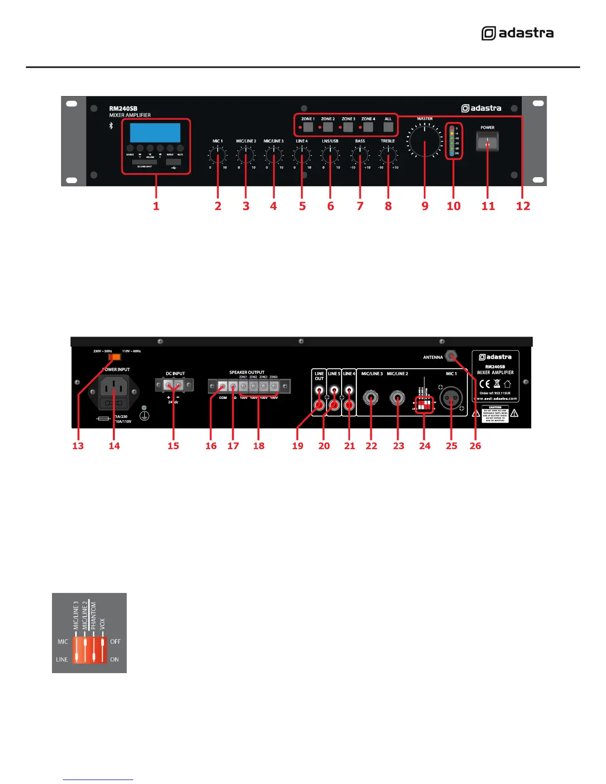 MIC/LINE 2 (23) and MIC/LINE 3 (22) inputs can be set to MIC (up position) or LINE (down position)
