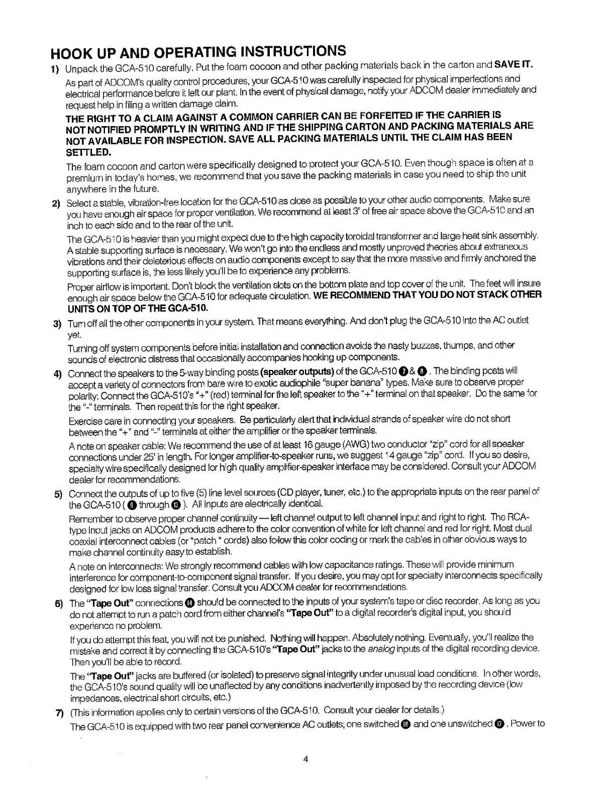 Adcom GCA-510 - Hook Up and Operating Instructions; Unpacking, Saving Materials, and Placement; Connecting Your Speakers; Connecting Line Level Audio Inputs