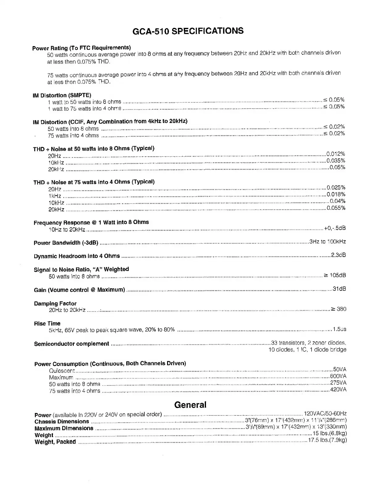 Adcom GCA-510 - GCA-510 Specifications; GCA-510 Power Output Ratings; Distortion and Frequency Response Specs; Other Performance Specifications