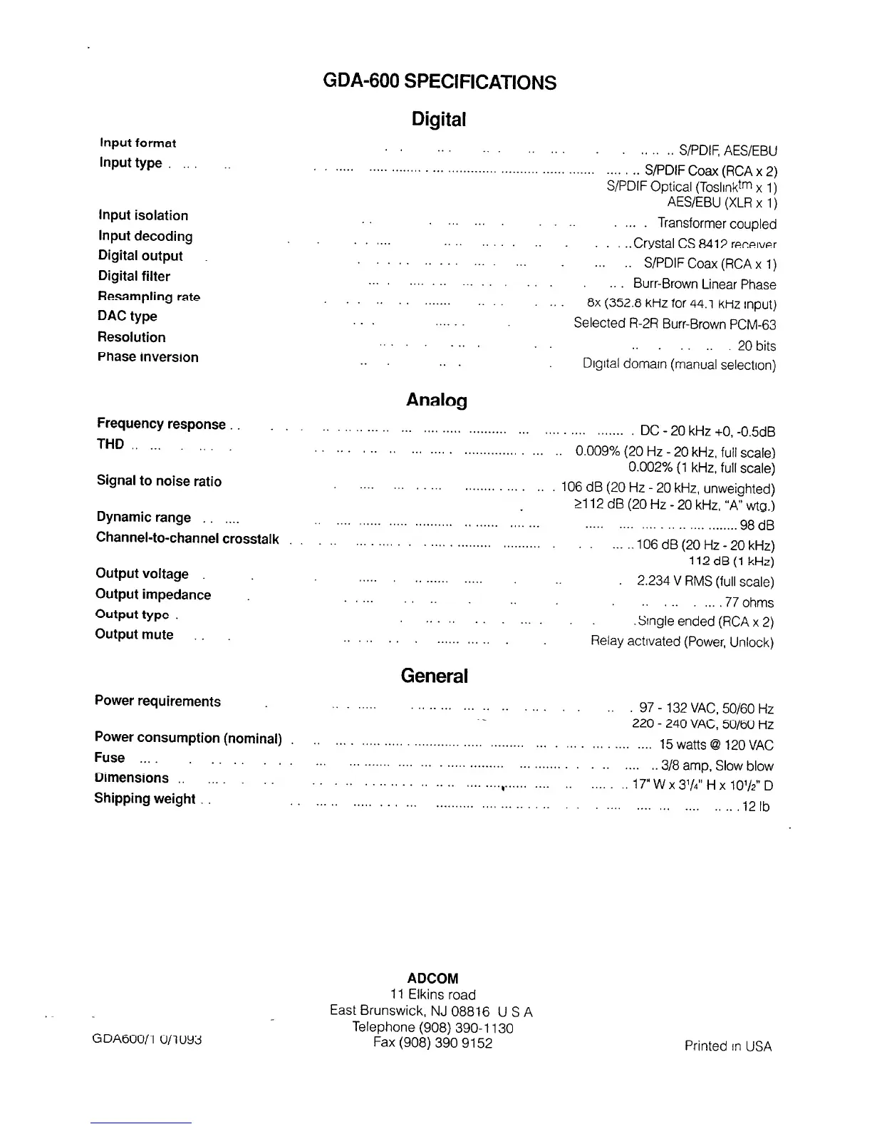 Adcom GDA-600 - Specifications