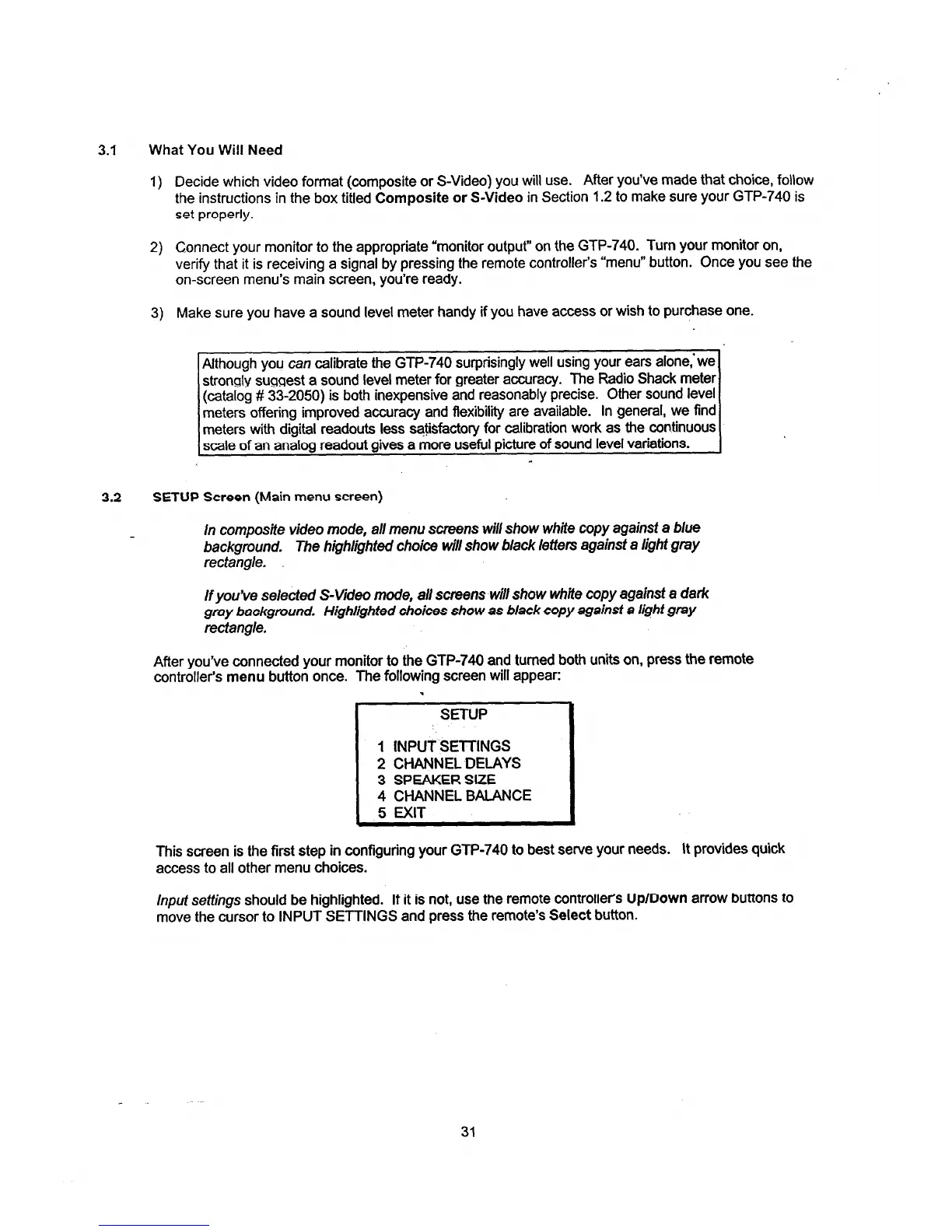 Adcom GTP-740 - Setup Screens and Input Settings