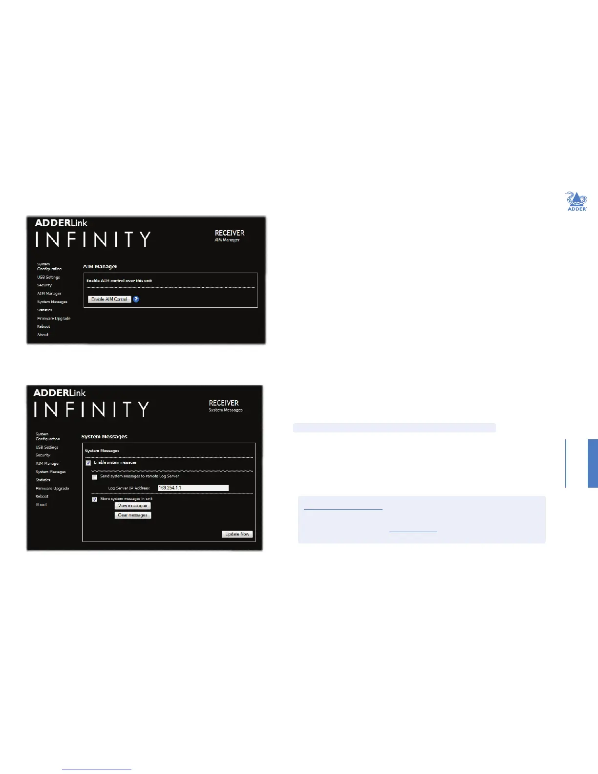 AdderLink Innity servers use the User Datagram Protocol (UDP) for all Syslog trafc.