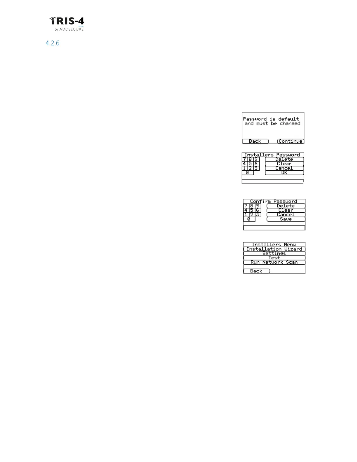 AddSecure IRIS-4 440 - Welcome menus; Installers password