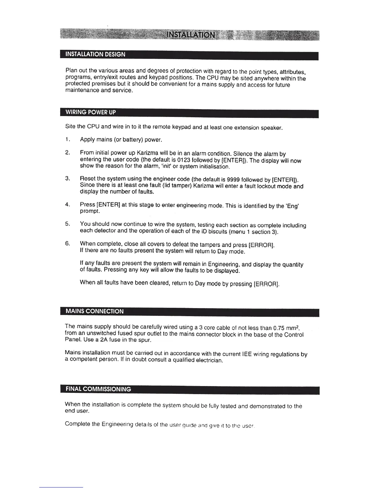 ADE Karizma - Installation; Installation Design; Wiring and Power Up; Mains Connection