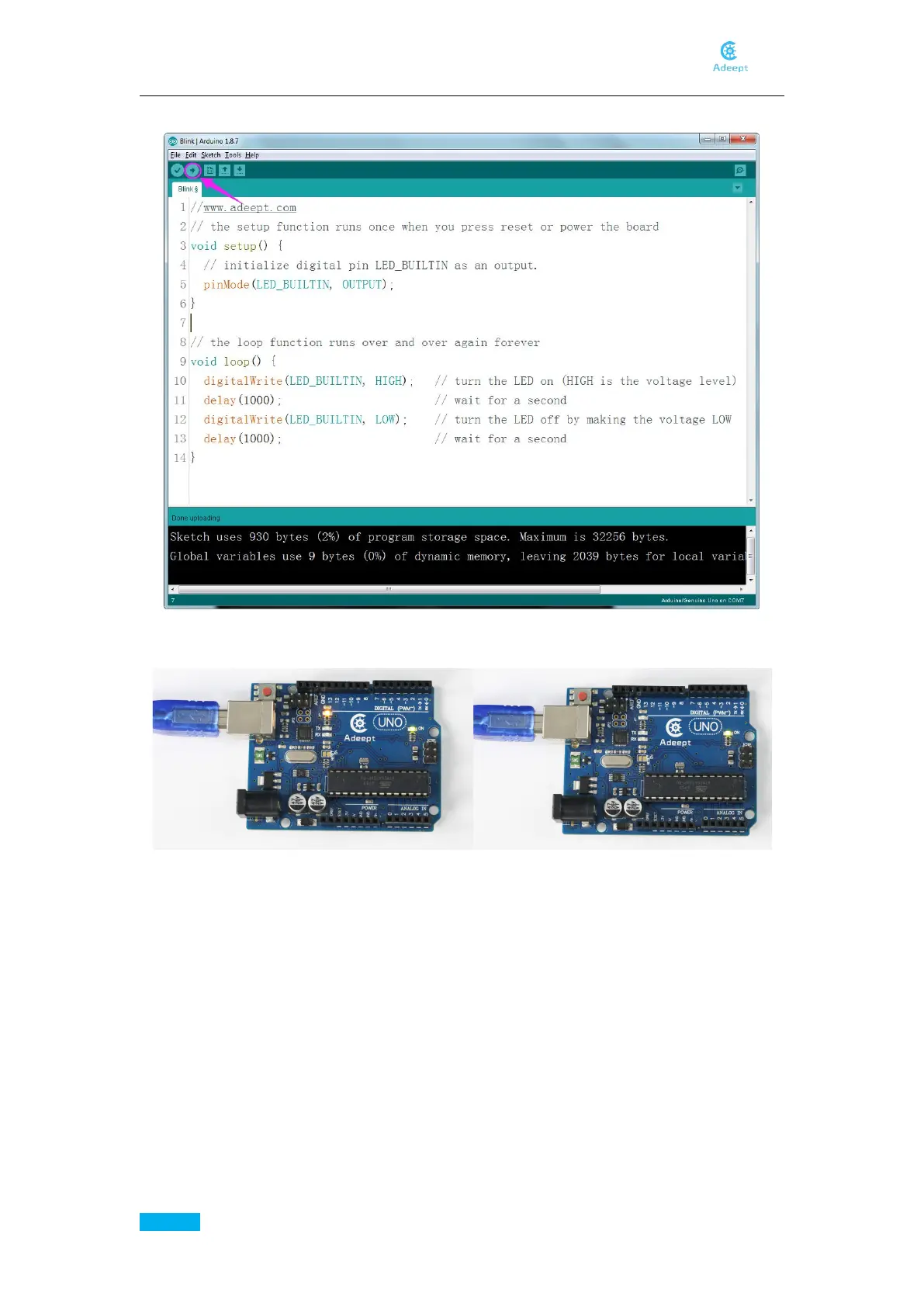 When the code is successfully downloaded to UNO, you can see the LED flashes.