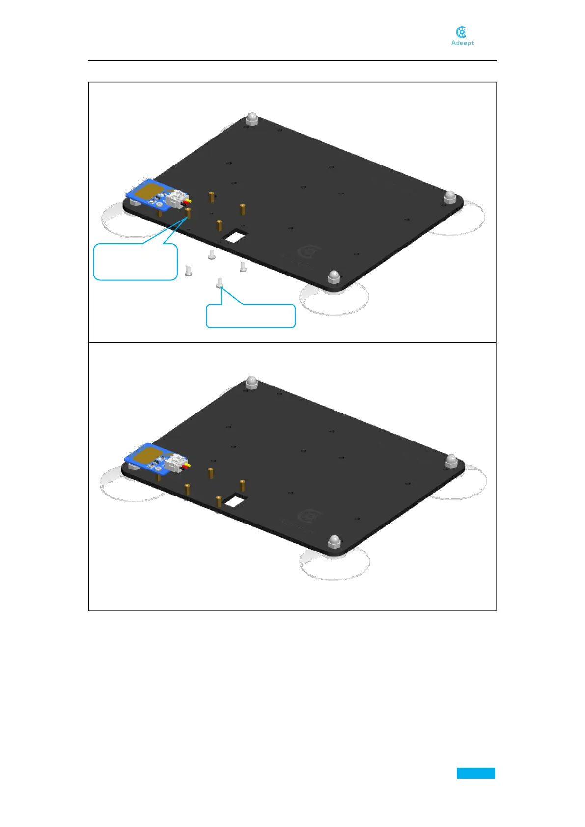 6. Fix four M2*6 Copper Standoffs to A01.
