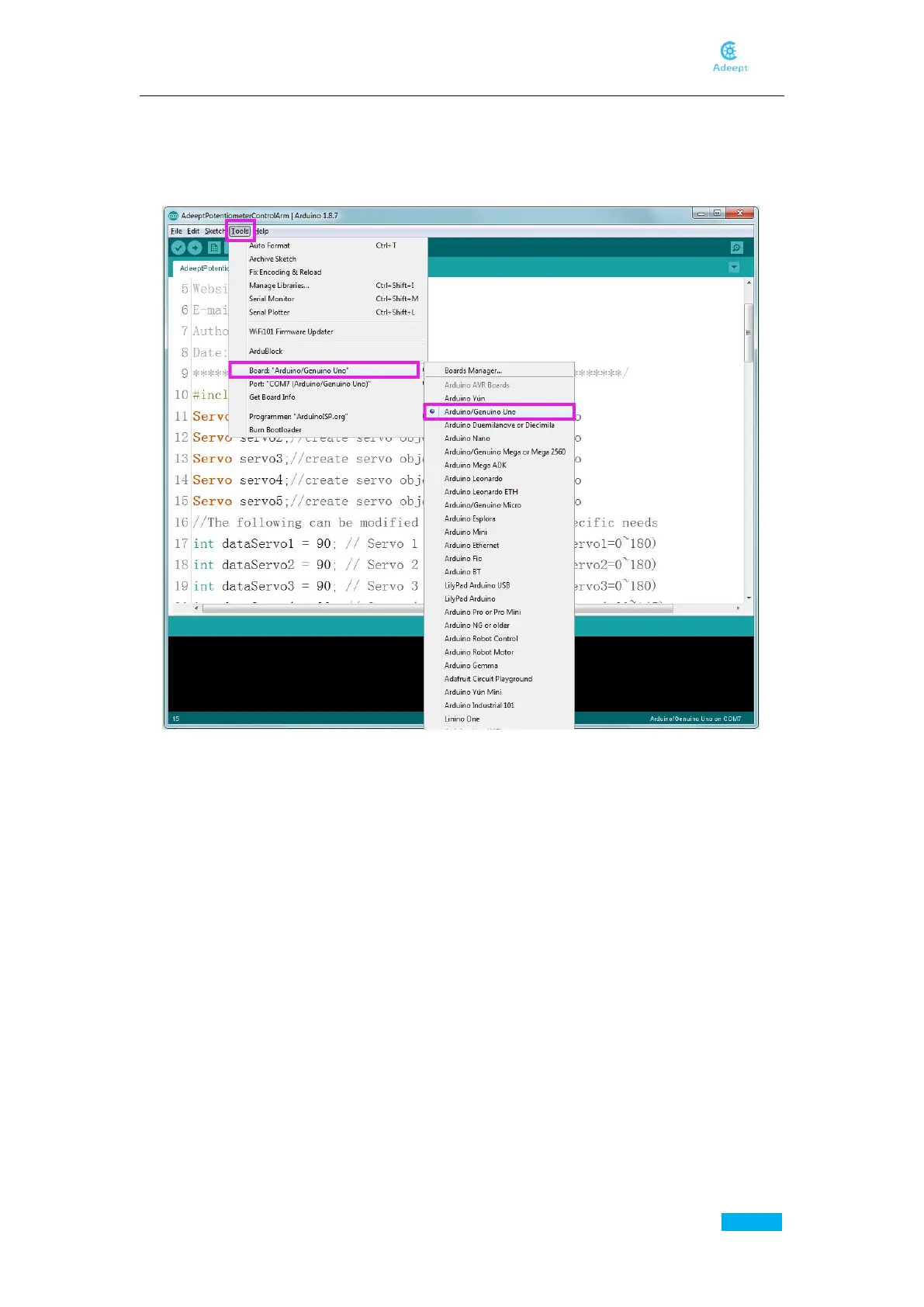 Motor software "Tools"->"Board"->"Arduino/Genuino Uno"