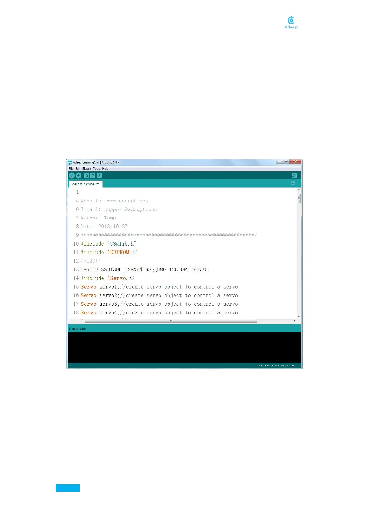 Firstly open the code AdeeptLearningArm.ino we provide.