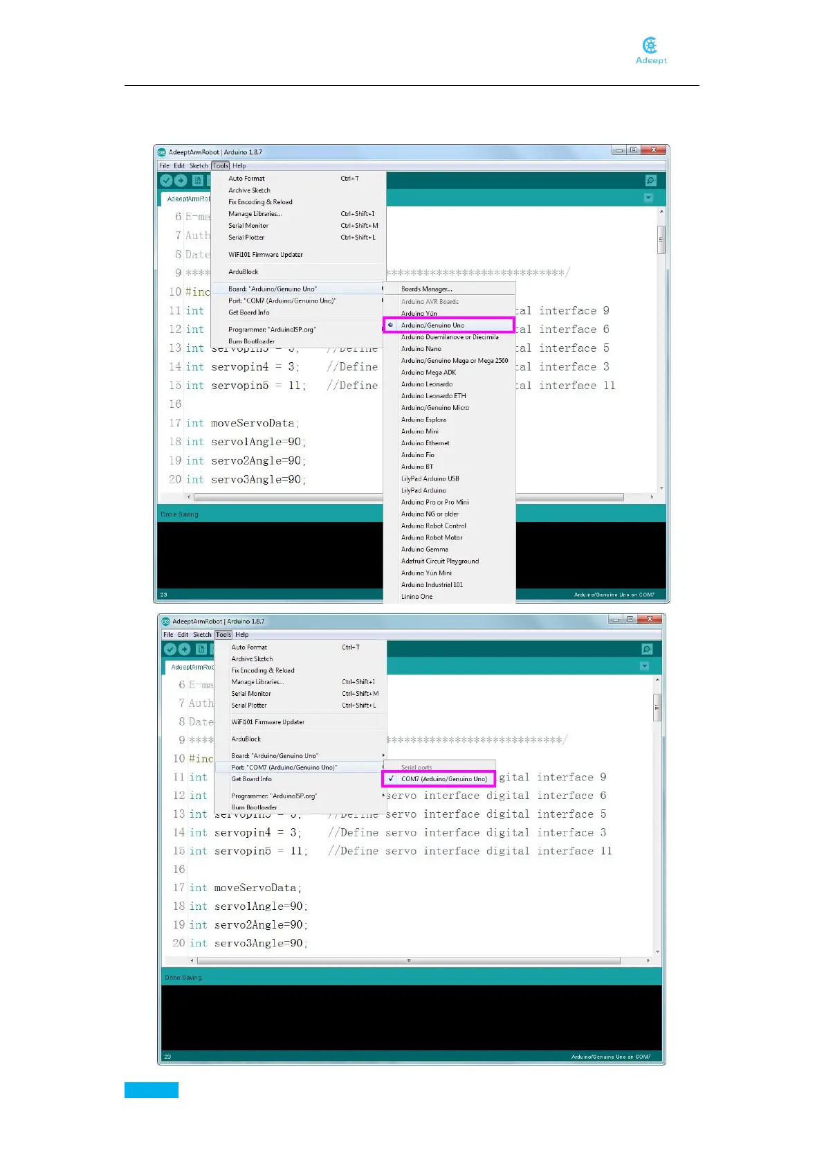 board model and port, as shown below: