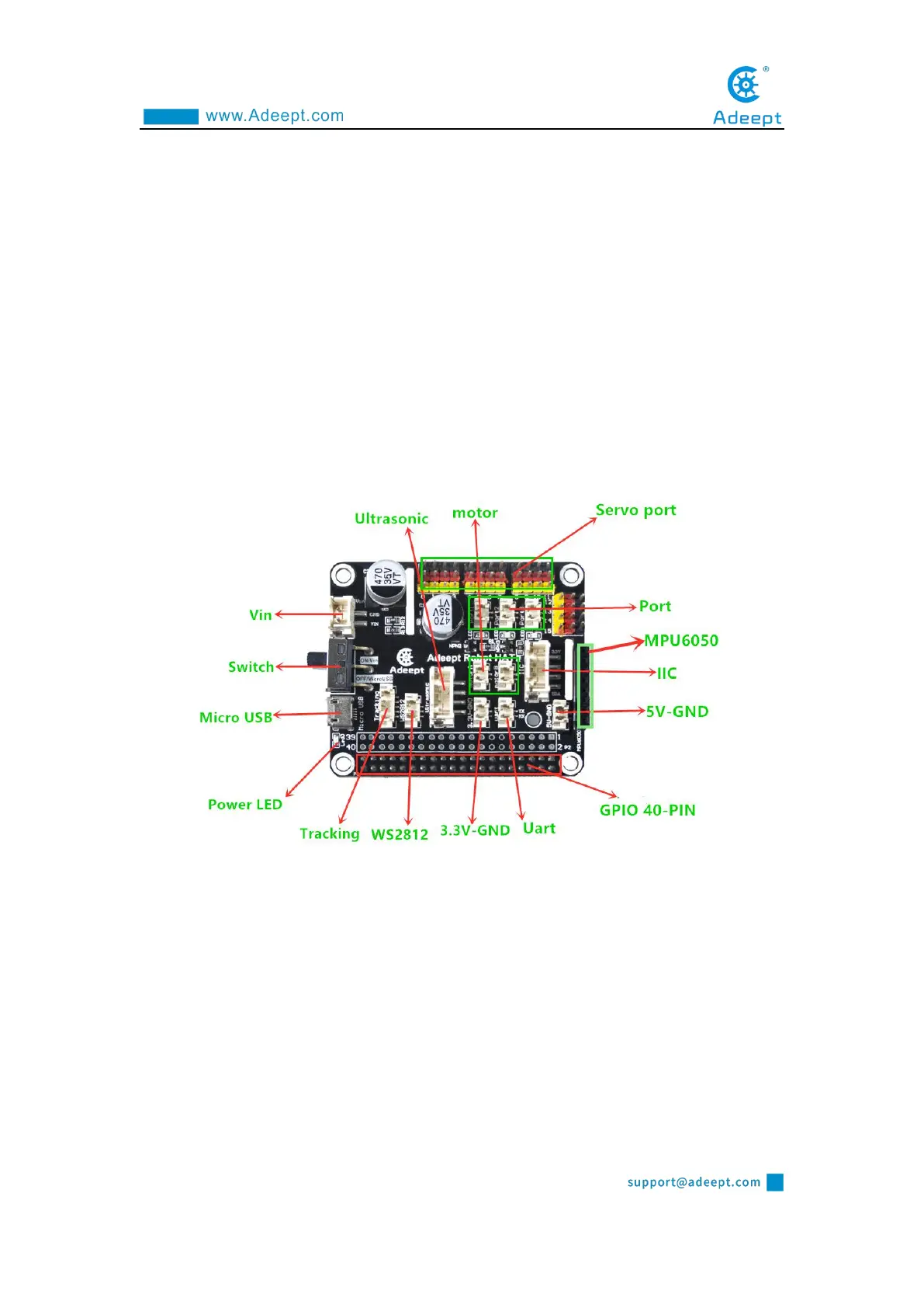 on it called: Adeept Robot HAT, which is an important part of PiCar Pro. There are