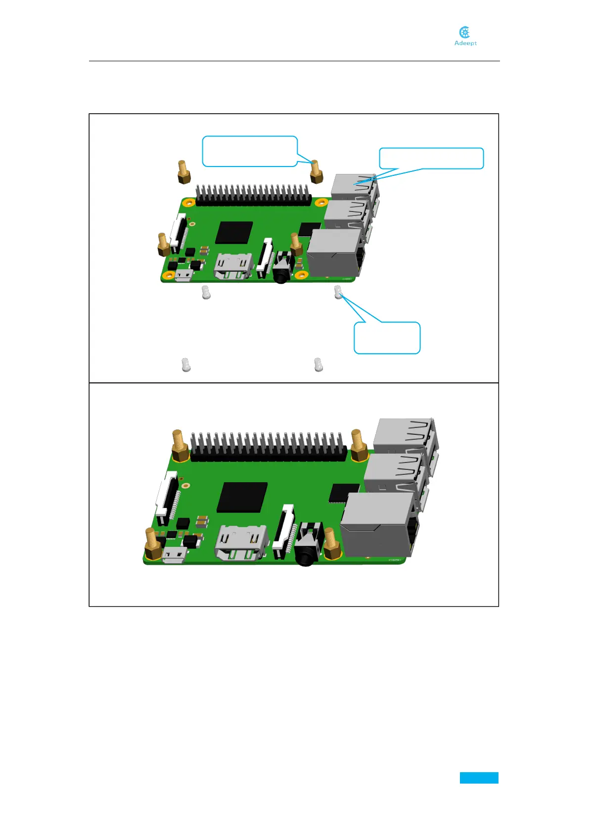 1. Fix four M2.5x4+6 Copper Standoffs on Raspberry Pi.
