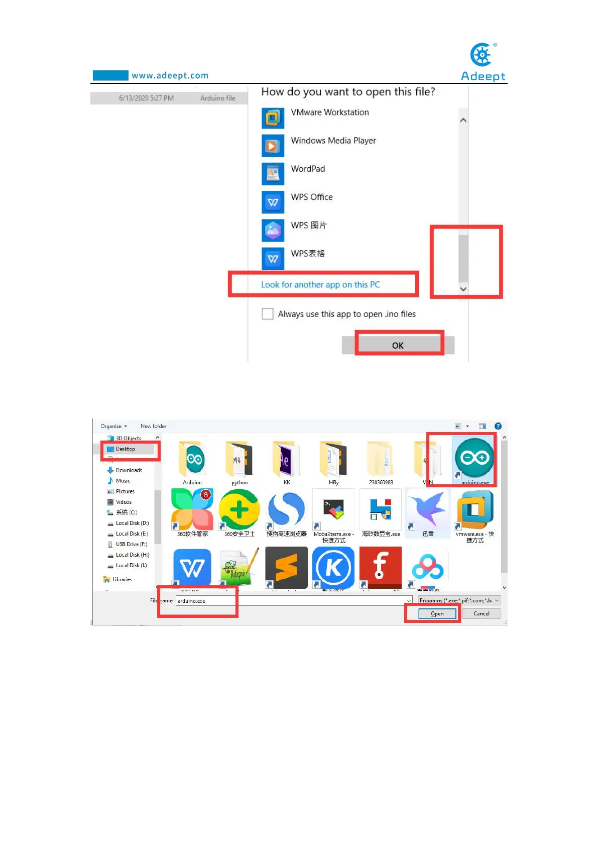 Arduino software, select it and click "Open".
