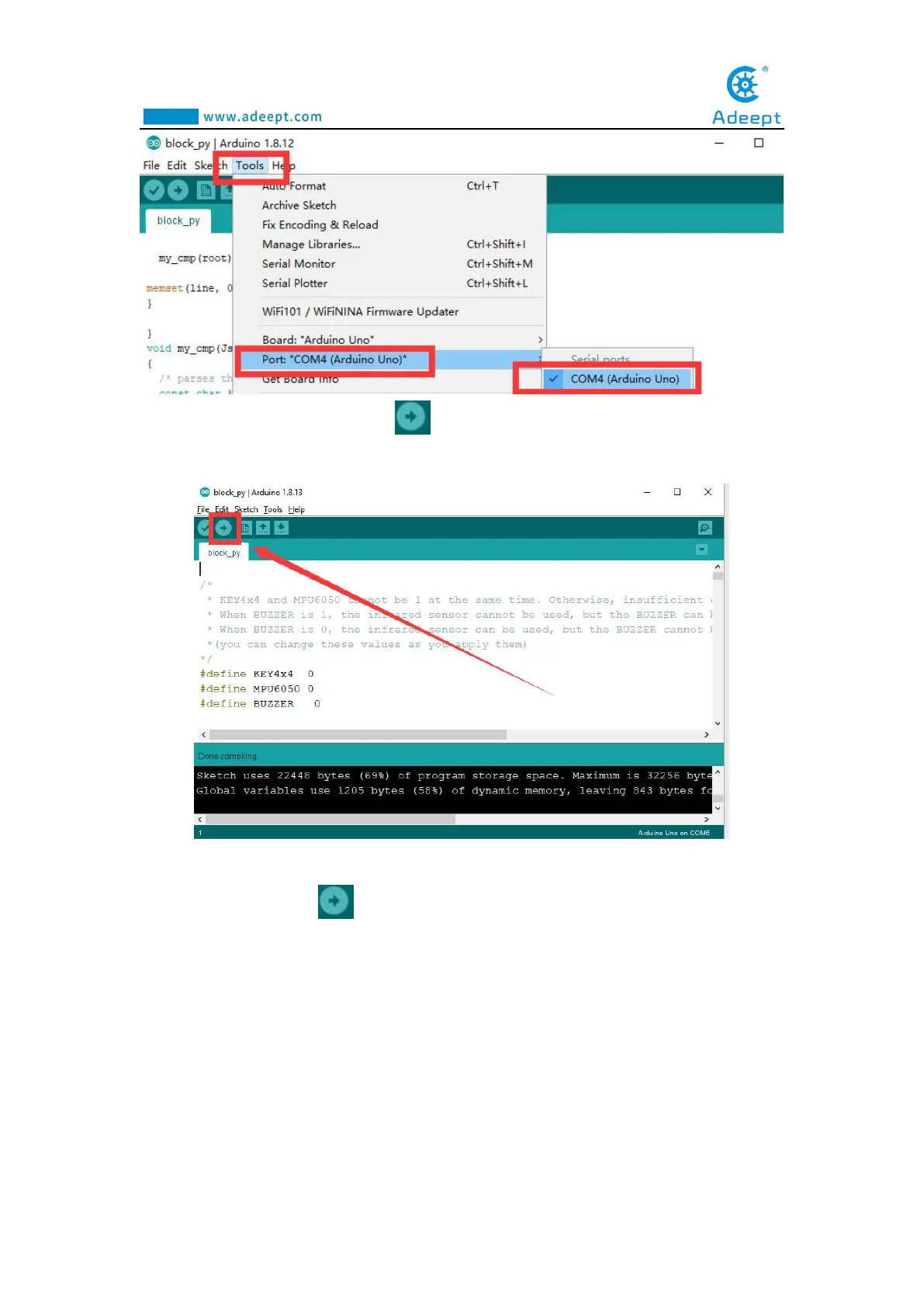 click the Upload button again to download the code program to the Adeept Arm