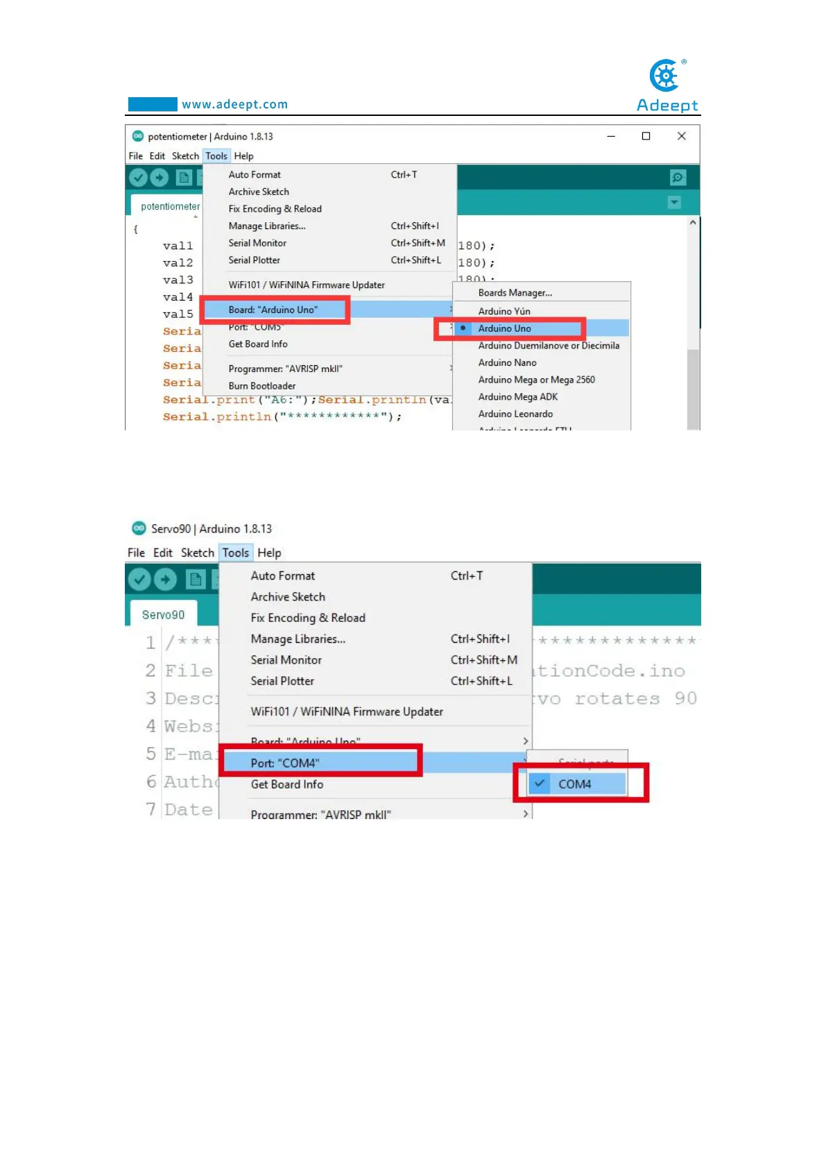 3.In the Tools toolbar, find “Port” and Select the port number of The Adeept Arm