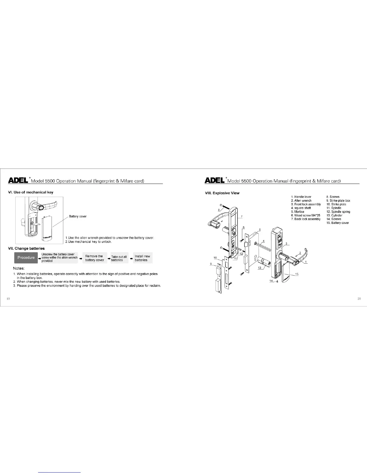 Adel 5500 - Use of mechanical key; Change batteries; Explosive View