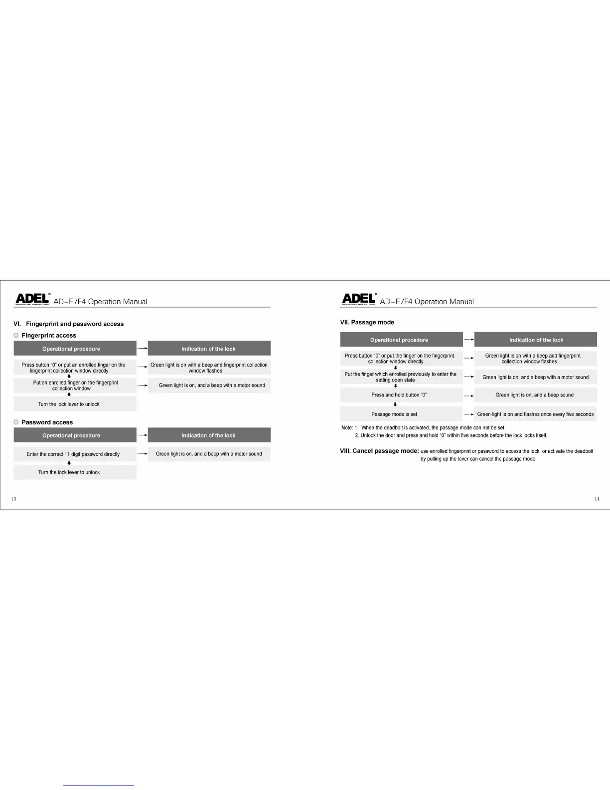Adel AD-E7F4 - VI. Fingerprint and password access; Fingerprint access; Password access; VII. Passage mode
