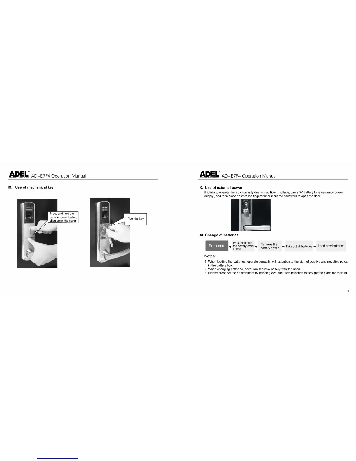 Adel AD-E7F4 - IX. Use of mechanical key; X. Use of external power; XI. Change of batteries