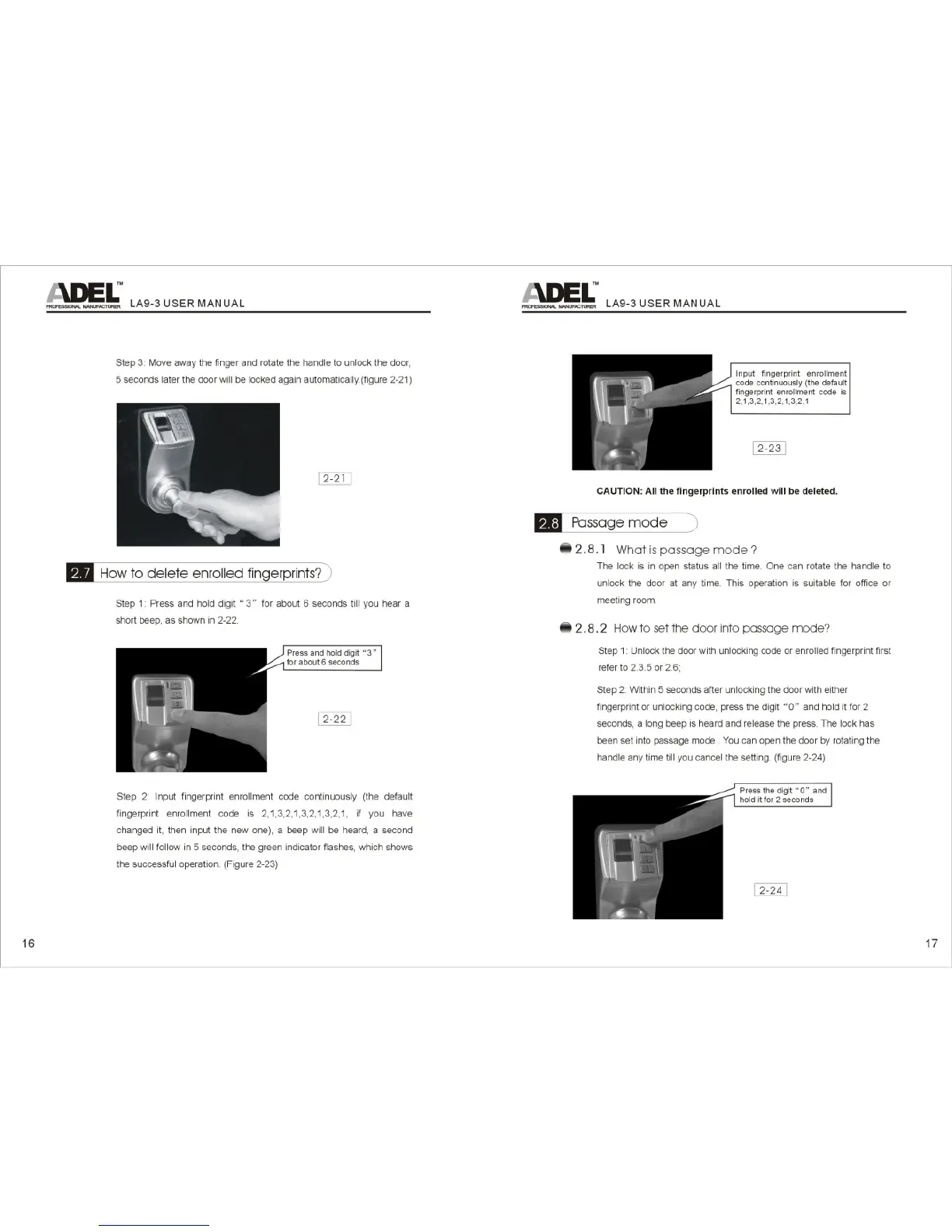 Adel LA9-3 - To Delete Enrolled Fingerprints; Passage Mode