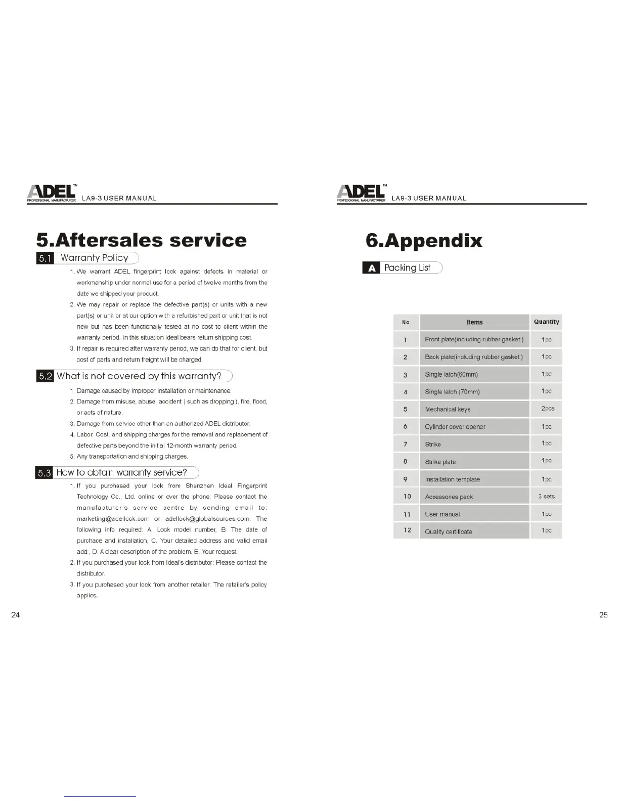 Adel LA9-3 - Aftersales Service; Warranty; Packing List