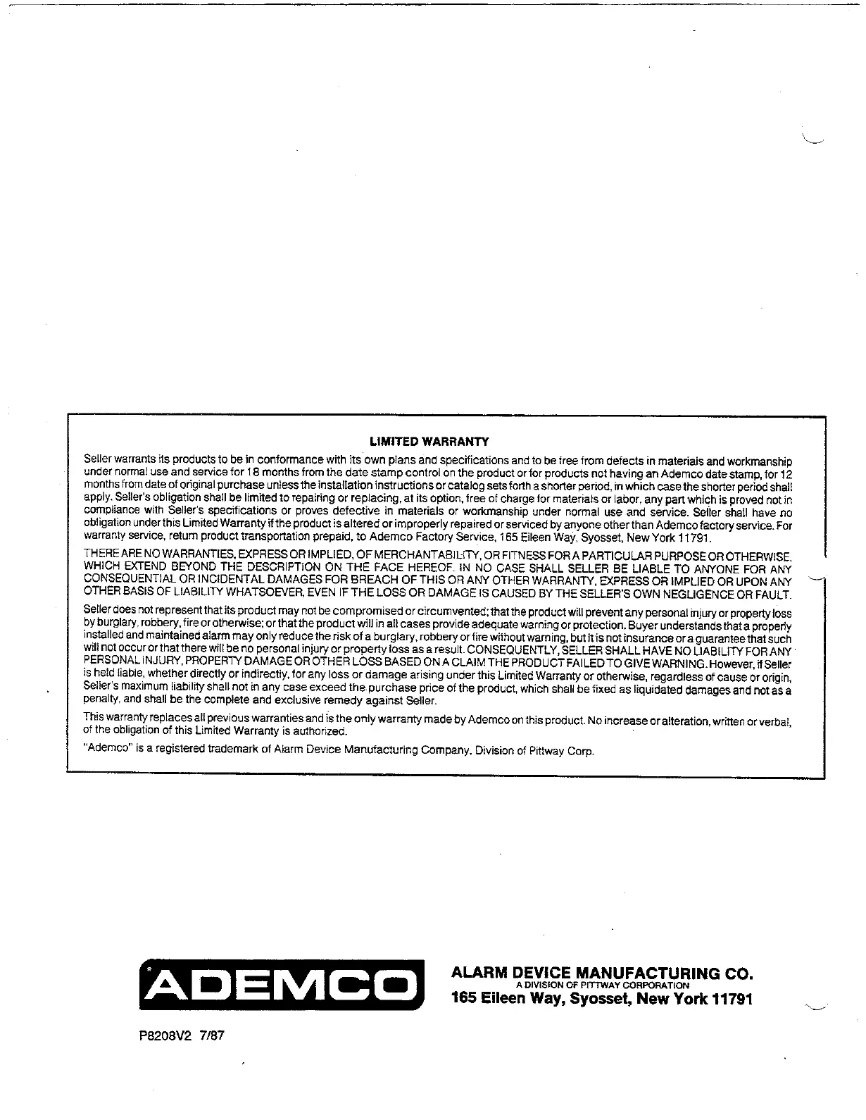warranly sewtce. return product tmnspofiafion prepaid. to Ademco Factov %wice, 165 Eileen Way, Syosset, New York 11791.